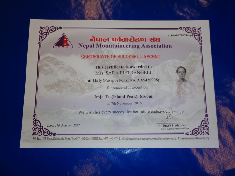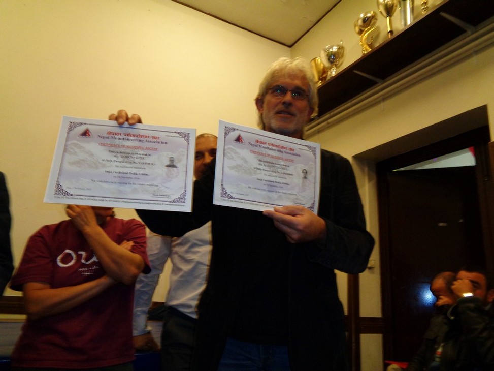 Claudio ha sorpreso tutti quando alla fine della serata ha consegnato ai partecipanti un raro attestato emesso per l’occasione dalla “ Nepal Mountaineering Association “ a ricordo della salita come vedrete dalla foto allegata.