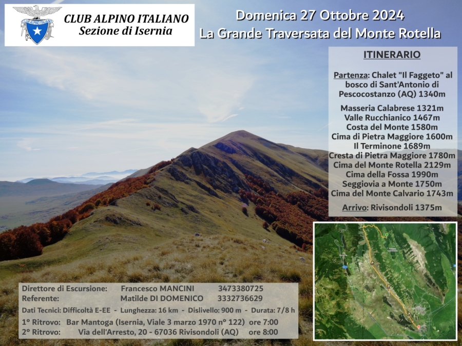 DOMENICA 27 OTTOBRE 2024 alla scoperta di un itinerario unico per raggiungere questa montagna che si trova nella parte più meridionale del Parco Nazionale della Maiella. Raggiungeremo la sua vetta attraverso un sentiero che partendo dal meraviglioso bosco autunnale di Sant'Antonio prende la cresta in uno dei punti meno conosciuti come il Terminone. Si continua fino alla cima del Rotella che su cresta, qui larga e agevole, ci regalerà panorami sconfinati che vanno dall’Altopiano delle Cinque Miglia, alla Maiella, al Pizzalto, al Genzana, alla Conca Peligna fino al Gran Sasso !!!