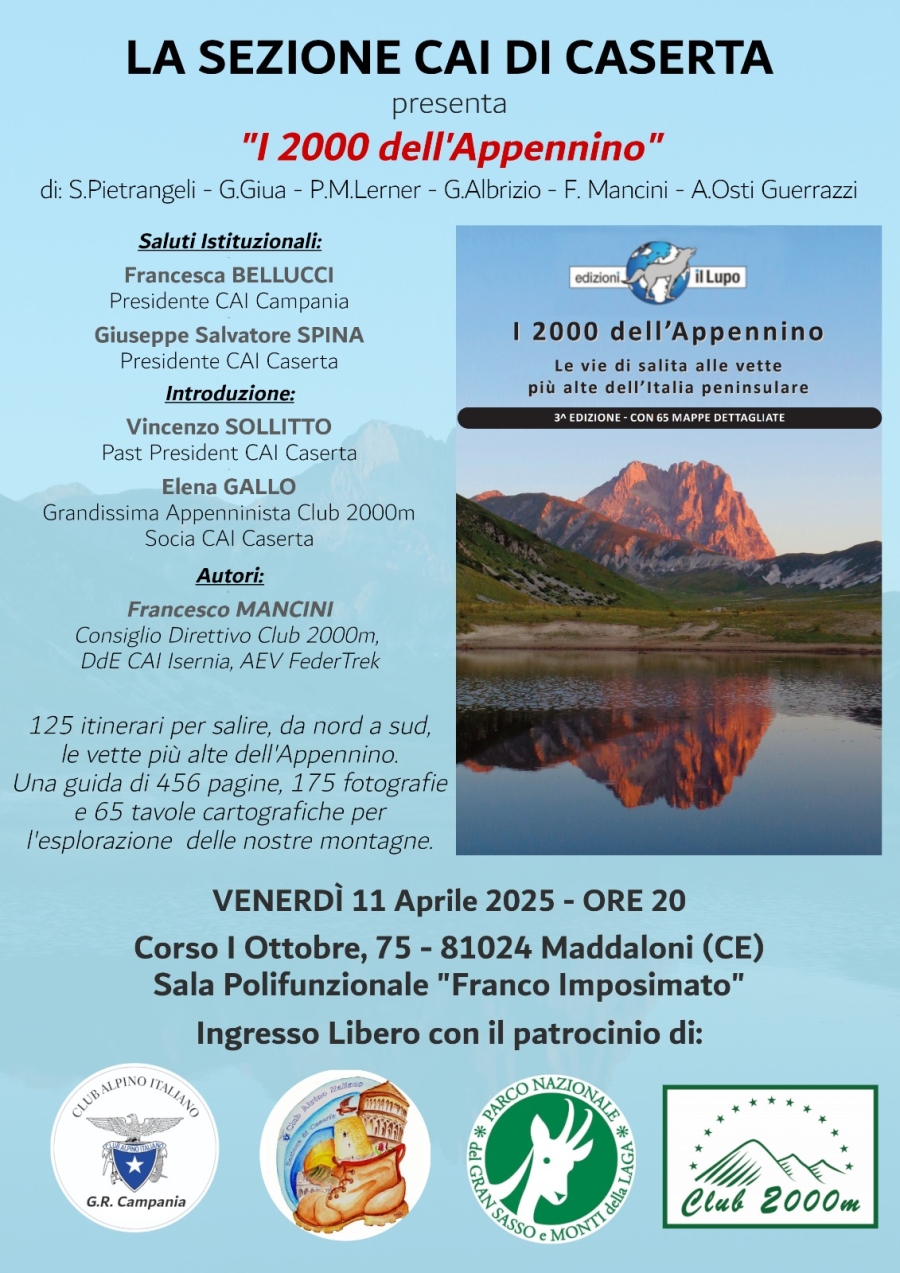 VENERDI' 11 APRILE 2025 alle 20 continua il grande tour di presentazione de I 2000 DELL'APPENNINO. Saremo in CAMPANIA ospiti del CAI di CASERTA. Con i saluti istituzionali del Presidente Regionale Francesca Bellucci e del Presidente di Sezione Giuseppe Salvatore Spina si ringrazia in particolar modo il PAST PRESIDENT della locale sezione Vincenzo Sollitto e la Grandissima Appenninista Elena Gallo per il coordinamento organizzativo. Tutte le cime più alte dell’Appennino, dopo il CAI di ISERNIA, in viaggio sempre più a Sud Italia !!!