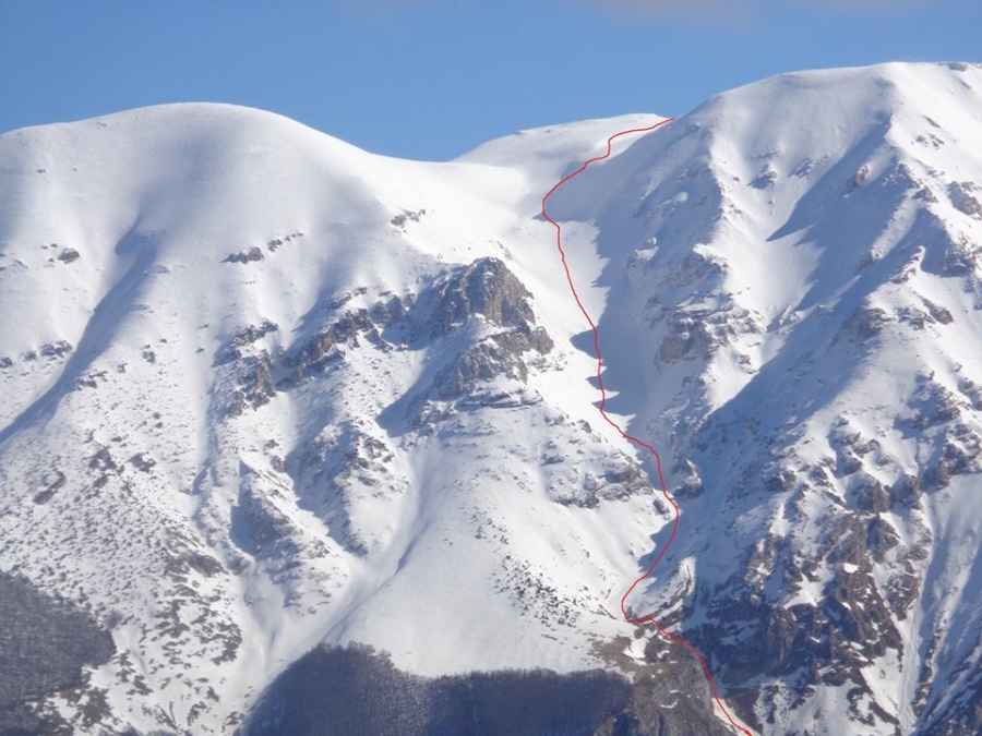 Questa mia foto fa vedere chiaramente la Rava del Ferro, percorso alpinistico non difficile da me percorso più volte, con partenza da Lama Bianca (S. Eufemia a Maiella, PE) (1380 metri) per arrivare alla Sella della Majella che intorno ai 2400 metri può permettere di raggiungere sulla sx il Pescofalcone oppure sulla ds l'Amaro...percorrerla ti lascia sensazioni uniche...
